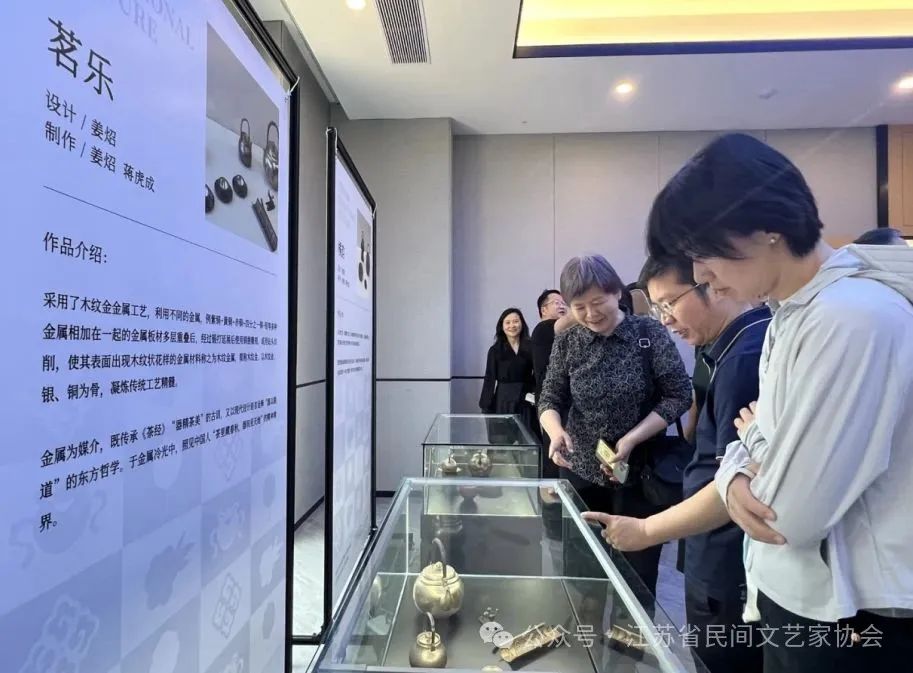 5月30日,由江苏省民间文艺家协会与中共南京市浦口区委宣传部联合主办的“茉莉花开·青春绽放”青年民间文艺家作品展在南京浦口水墨大埝景区开幕。此次活动是江苏省文联“茉莉花开”文艺轻骑兵志愿行品牌建设的重要举措,通过优质文艺资源下沉,为乡村振兴注入文化动能。此次展览展出了六位江苏青年民间工艺美术家作品。金属工艺艺术家姜炤,在金属工艺这条路上持续深耕二十余年,此次展览,与其徒弟蒋虎成一同携手,以独特工艺诠释匠心。《橘韵》以柑橘科植物为灵感,运用金属锻造工艺,将丑橘、丑柑的天然肌理转化为器物语言。《茗乐》以木纹金、银、铜为骨,凝炼传统工艺精髓。于金属冷光中,照见中国人“茶里藏春秋,器间见天地”的精神境界。扬州漆艺艺术家蒋超的展台上,皮漆荷韵漆瓶,以传统犀皮漆工艺精心打造,瓶身色彩丰富,绿、蓝、黄等色调交织,纹理如行云流水,恰似荷叶上滚动的露珠与荡漾的水波,自然且灵动。