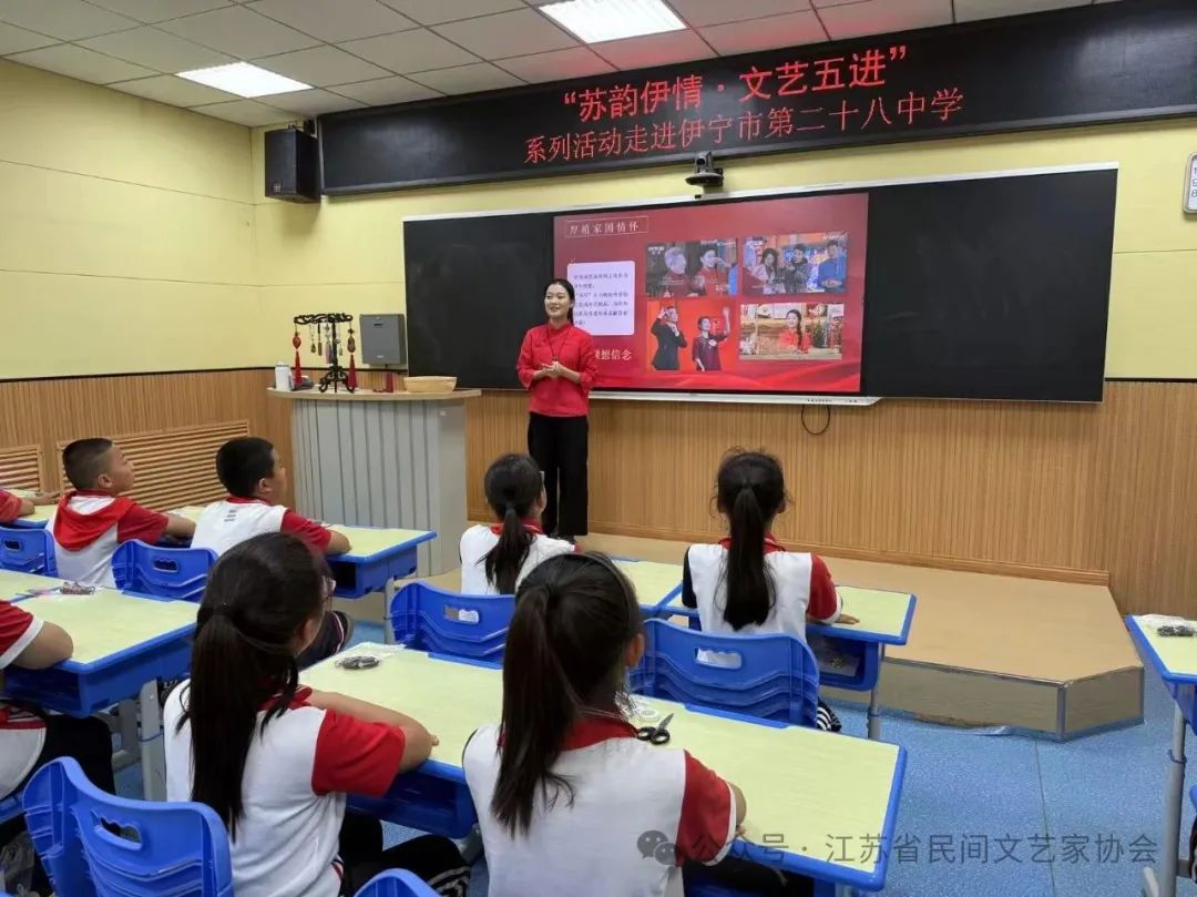 文化如水,润物无声;艺术如桥,联通心灵。为深入贯彻党的二十大和二十届二中、三中全会精神,全面准确贯彻落实新时代党中央对口支援战略部署,铸牢中华民族共同体意识,推动中华民族共同体建设,弘扬中华优秀传统文化,5月29日至6月3日,省民协组织5位艺术家赴新疆伊犁开展“苏韵伊情•文艺五进”文艺交流系列活动。本次活动由江苏援伊前方指挥部和江苏省文联指导,江苏省民协和伊犁州苏伊文化交流中心承办。5月30日,省民协剪纸专委会副主任孙洪香和徐州香包传承人孙歌尧,为伊宁市第二十八中学的同学们带来了两场精彩的民间工艺讲座。