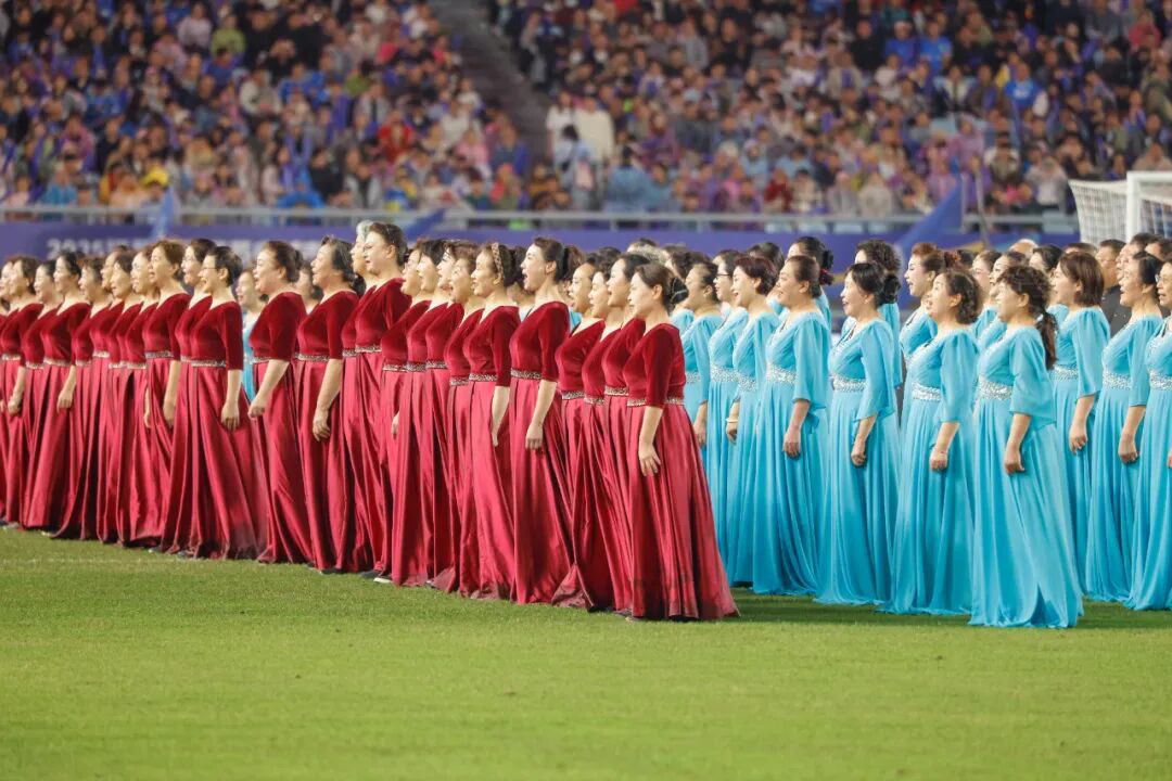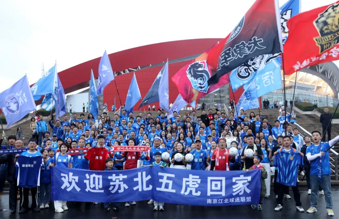 开赛前的南京奥体广场上,来自南京和徐州、连云港、宿迁、淮安、盐城等苏北五市的“苏超”球迷拉拉队手牵手,互相慰问致意。王亚东 摄