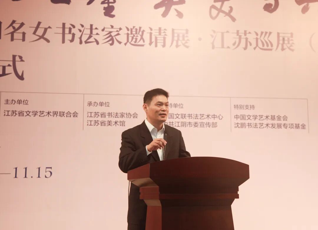 中国书协主席、中央文史馆馆员、江苏省书协主席孙晓云,中国美术馆党委书记杨雄,江苏省人民政府副秘书长刘建,中共江苏省委宣传部副部长徐宁,江苏省文化和旅游厅党组书记、厅长杨志纯,江苏省文联党组书记、副主席常胜梅,江苏省文化和旅游厅党组成员、副厅长李川,江苏省文联党组成员、副主席刘轩明,中国文联原书法艺术中心主任王彦,中国书协展览部主任史知元、江苏省美术馆馆长王法,江阴市委宣传部副部长余益平,江苏省书协副主席李啸、仇高驰、刘灿铭、黄正明、谢少承、马亚、金丹、常汉平出席开幕式,参加开幕式的还有江苏省人民政府、省委宣传部相关单位同志,受邀参加本次展览的女书家委员会委员和作者代表等。孙晓云、杨雄、刘建、徐宁、杨志纯、常胜梅为巡展揭幕。孙晓云、杨雄、刘轩明在开幕式上讲话。靳慧慧代表入展书家发言。开幕式由中国书协分党组成员、副秘书长张潇羽主持。